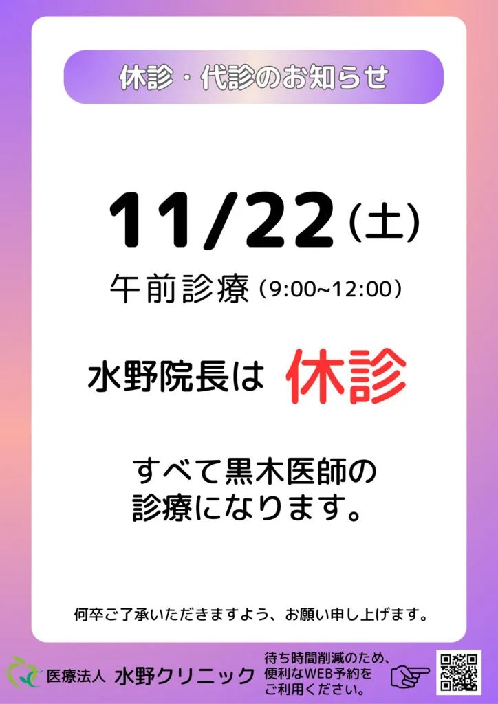 11/22(土)は、水野宅郎院長は休診となり、すべて黒木医師の診療となります。