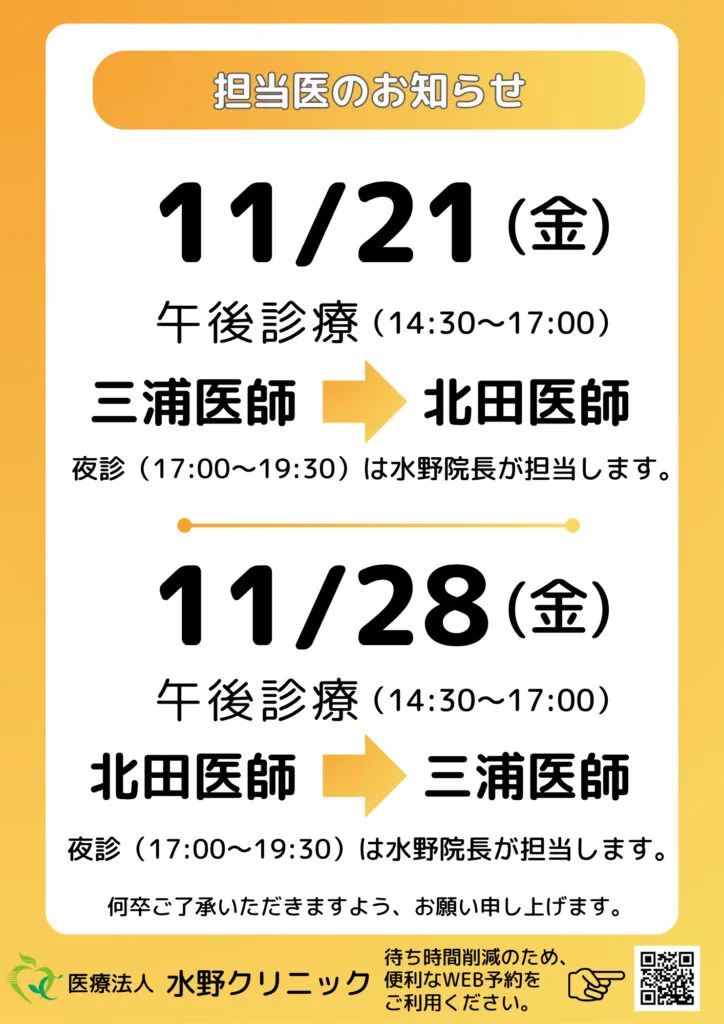 診察担当医変更のお知らせ:11/21(金)・28(金)