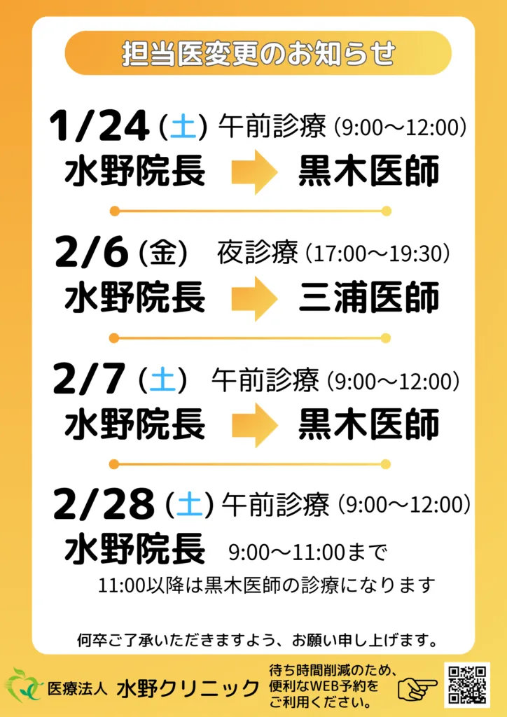 診察担当医変更のお知らせ:1/24(土)・2/6(金)・2/7(土)・2/28(土)