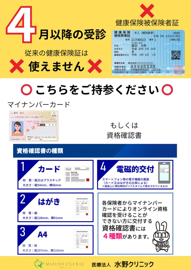 令和8年3月末をもって、従来の健康保険被保険者証の運用が終了いたします。 4月以降に受診される際は、